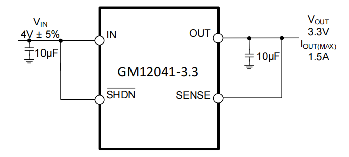 输出电压范围为 1.21V 至 20V。GM12041 稳压器稳定,输出电容低至 10μF。内部保护电路包括电流限制和热限制。该器件有 1.5V、1.8V、2.5V、3.3V、5V 的固定输出电压,以及 1.21V 参考电压的可调输出电压。