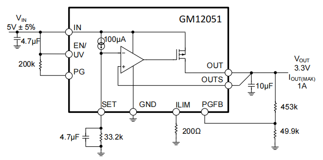 GM12051 能够在采用 10µF(最小值)陶瓷输出电容的情况下实现稳定。内置保护功能电路包括内部电流限制和过热保护。GM12051 采用耐热性能增强型8引脚和 10 引脚 3mm x 3mmDFN 封装和 12 引脚 4mm x 4.9mm DFN12 封装。其中 DFN12封装 VIOC 跟随功能可控制前级开关电源输出电压以维持GM12051 恒定的压差,从而实现最小化功耗。