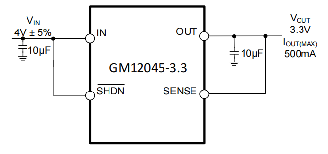 输出电压范围为 1.21V 至 20V。GM12045 稳压器稳定,输出电容低至 10μF。内部保护电路包括电流限制和热限制。该器件有 1.5V、1.8V、2.5V、3.3V、5V 的固定输出电压,以及 1.21V 参考电压的可调输出电压。