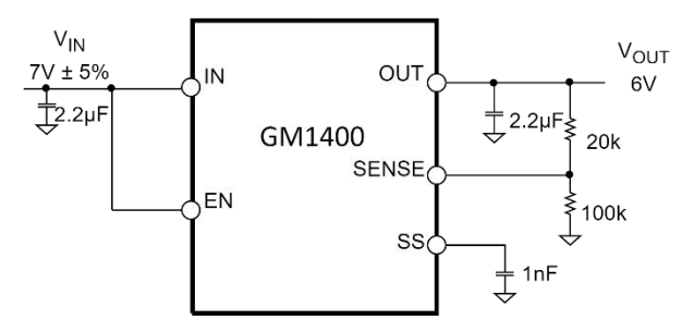 每个固定输出电压都可以通过外部反馈分压器在初始设定 点以上调整。这使 GM1400 可提供 1.2V 至 VIN − VDO 的输 出电压且具有高 PSRR 和低噪声。