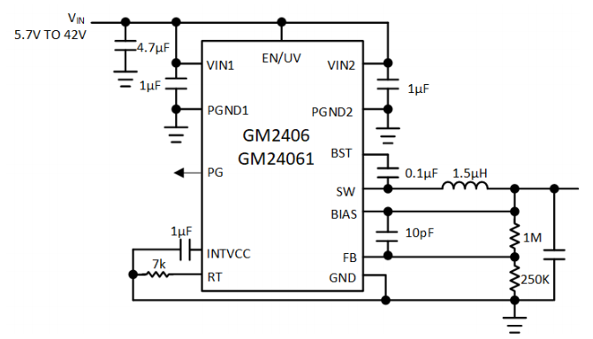 基本功能内置于器件之中并且简单易用:一个漏极开 路 PG 引脚负责在输出处于调节范围内时发出指示信号。 GM2406 工作于低功耗模式而 GM2406-1 则工作于强制连续模式。准确的使能门限可采用 EN 引脚设定,而一个位于 RT 引脚的电阻器则负责设置开关频率。