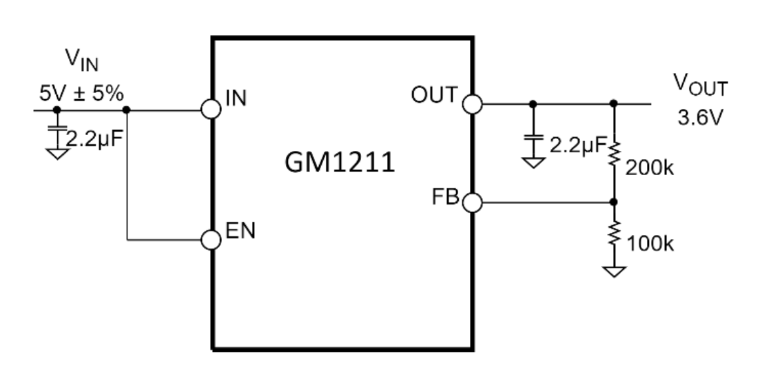 GM1211 提供 16 种固定输出电压选项。现有库存提供下列 电压版本:1.2V(可调节)、1.5V、1.8V、2.5V、3.0V,3.3V .3.6V和 5.0V。