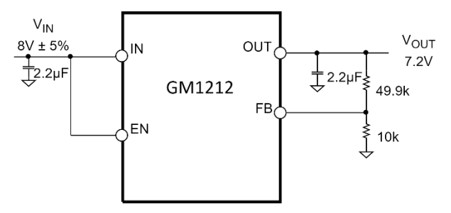 每个固定输出电压都可以通过外部反馈分压器在初始设定 点以上调整。这使 GM1212 可提供 1V 或 1.2V 至 VIN − VDO 的输出电压且具有高 PSRR 和低噪声。